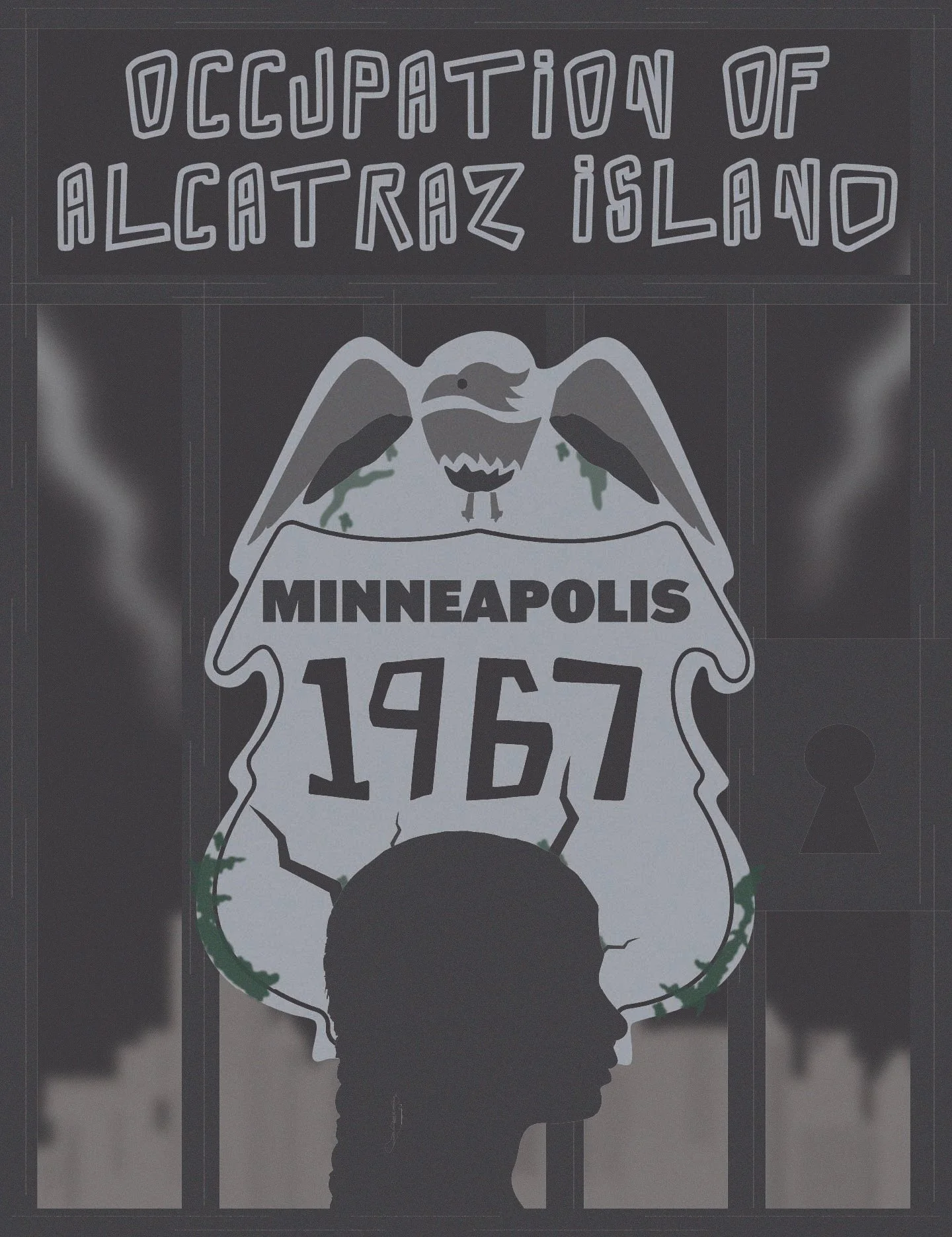 In this poster, the corrupted badge represents the police brutality and survellieve that helped spark AIM’s formation in Minneapolis. The vulture replaces the eagle to symbolize a system feeding on Indigenous suffering. Moss and cracks show how long these injustices have been present, while the silhouette represents Clyde Bellecourt being arrested at 11 years old for petty crimes. Together, the imagery reflects a turning point when Native Americans reclaimed visibility, voice, and land.