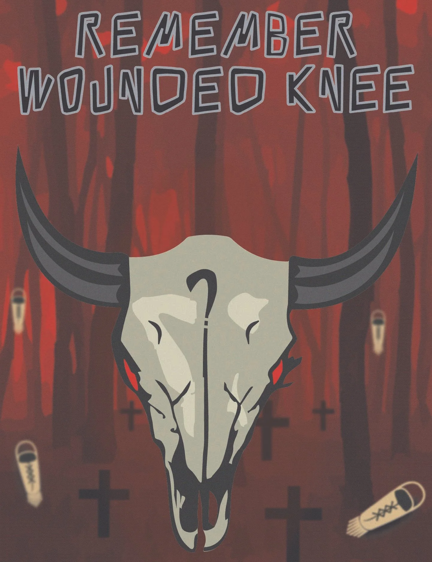 In this poster, the buffalo skull represents both death and survival. The cradleboards acknowledge the children who were lost in 1890 and those whose futures were shaped by the trauma that followed. The forest of crosses stretches into the distance, symbolizing the scale of loss without depicting it directly. A subtle question mark crack carved into the skull reminds the viewers that the true number of lives taken remains unknown. The piece stands as a reflection of grief, resistance, and remembrance.