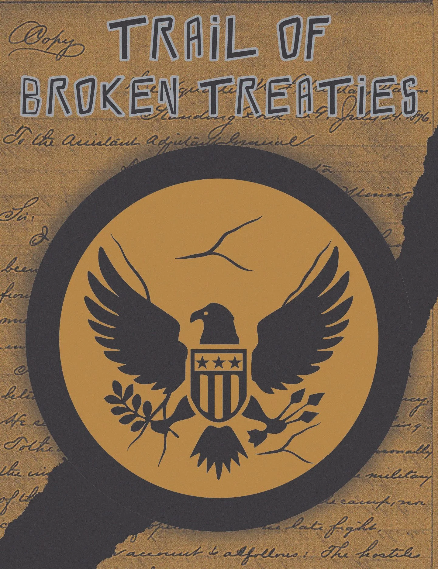 This poster uses a torn treaty to represent the fracture between federal promises and lived reality. The gold, creacked seal symbolizes a government whose authority was built on documents it later ignored. The seal’s weight bends the treaty beneath it, showing how federal power destroyed agreements instead of honoring them.